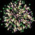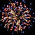 Разноцветные кометы, золотые с красными искрами трассы разрываются сферами из: золотых с красными искрами форсов и зелёных огней; коротких искристых трещащих форсов, зелёных, фиолетовых, синих и красных мерцающих огней; золотых с золотыми искрами форсов и зелёных мерцающих огней.