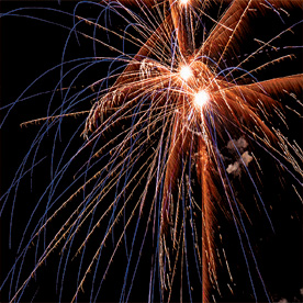 15. синих огней и золотых форсов с трещащими серебряными искрами (залп).