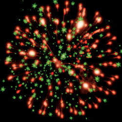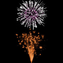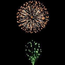 Нижний уровень. Золотые трещащие букеты. Букеты из зелёных огней. Верхний уровень. Разноцветные кометы разрываются сферами из: оранжевых и мерцающих зелёных, красных огней; золотых форсов и оранжевых огней; фиолетовых огней с короткими серебряными форсами.