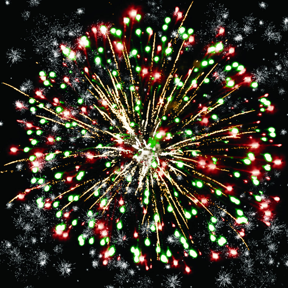 3. красных и зелёных огней, множества трещащих сфер (залпы).