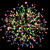 Золотые трещащие искристые трассы разрываются сферами из цветных трещащих огней и разлетающихся искр.