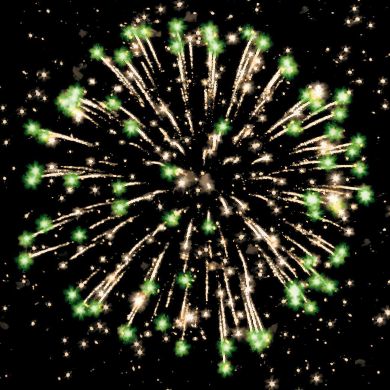 Разноцветные кометы, трещащие трассы разрываются сферами из: Зеленых мерцающих огней с золотыми форсами в центре. Серебряных мерцающих огней с серебряными форсами с зелеными огнями на концах в центре. Букеты из золотых форсов с красными огоньками на концах. Букеты из красных, зеленых и синих огоньков. Золотых форсов, фиолетовых и зеленых огней. Золотых форсов, синих и голубых огней. Золотых форсов с зелеными мерцающими искрами и зеленых огней. Золотых форсов с трещащими мерцающими серебряными искрами и оранжевых огней. Серебряных искристых форсов. Серебряных искристых форсов, красных мерцающих огней и золотых форсов с трещащими серебряными искрами.