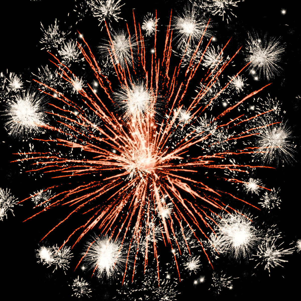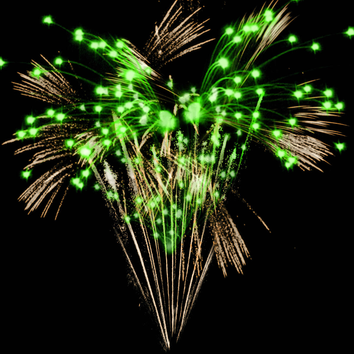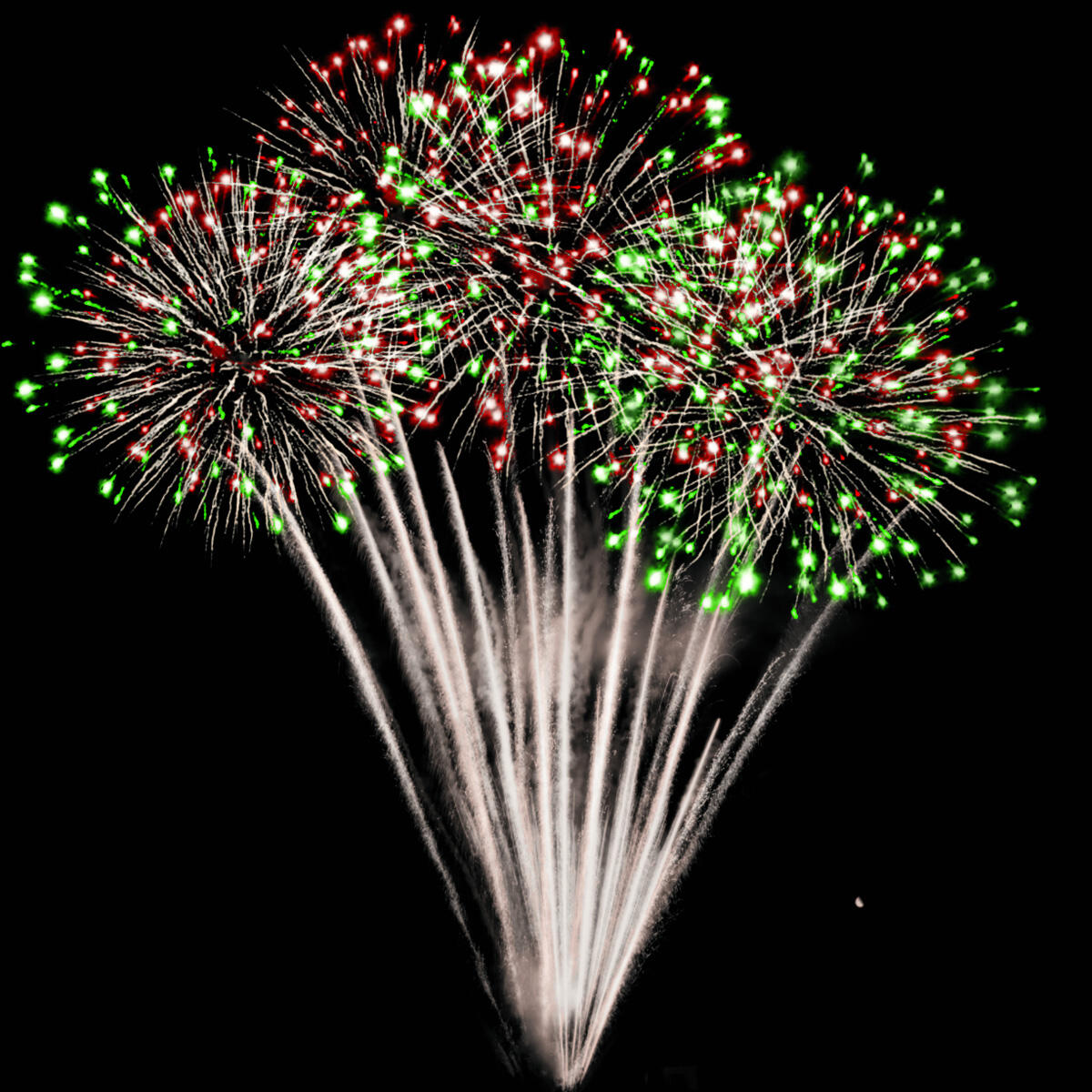 5. Веер. Форсовые серебряные трассы в центре, сферы из серебряных форсов, крупных красных и зелёных мерцающих огней. Красочный залп в финале.