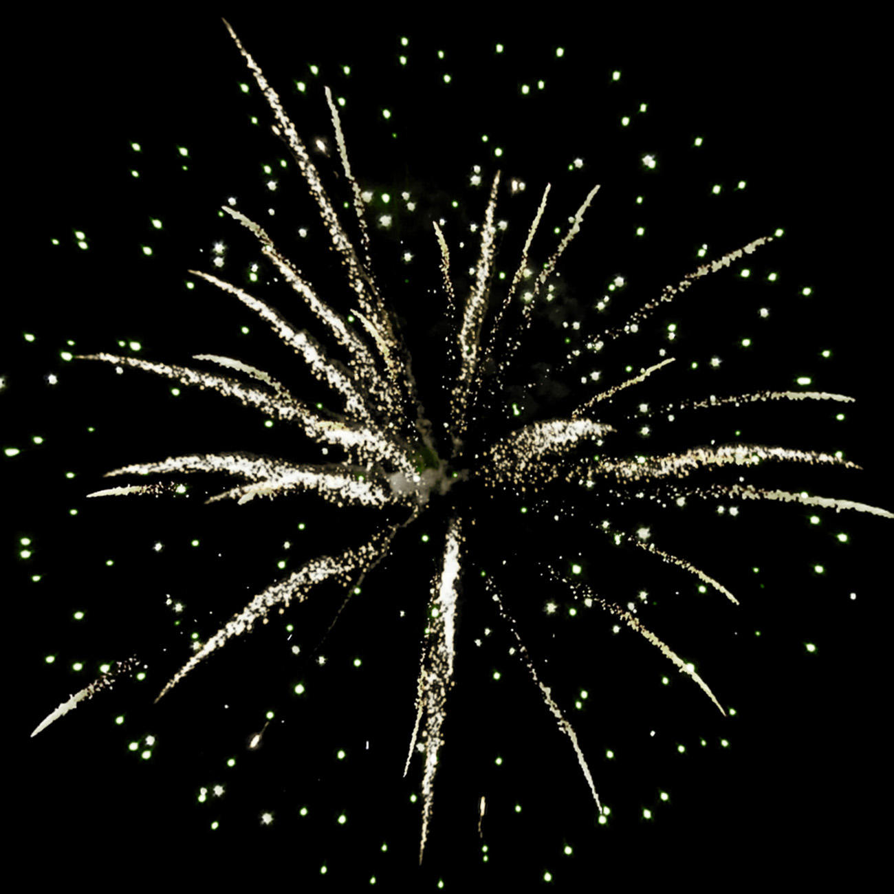 Разноцветные кометы, свистящие элементы, спиралеобразные трассы разрываются сферами из золотых и серебряных форсов и трещащих огней.